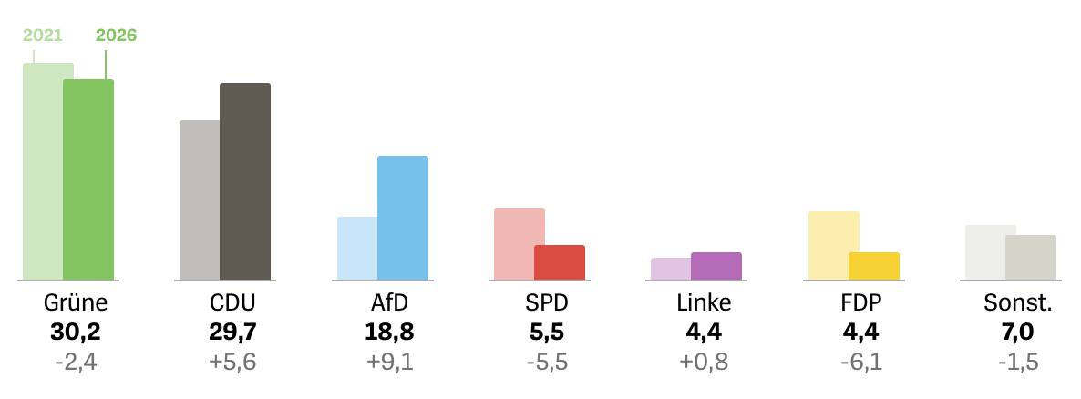 Nach den vorläufigen amtlichen Ergebnissen der Landtagswahl vom 8. März 2026 kommen die Grünen auf 30,2 Prozent, die CDU auf 29,7 Prozent, die AfD auf 18,8 Prozent und die SPD nur noch auf 5,5 Prozent. FDP und Linke scheitern jeweils mit 4,4 Prozent an der Fünfprozenthürde. Im neuen Landtag sitzen damit nur noch vier Parteien; die SPD ist mit gerade einmal zehn Listenmandaten vertreten. Das Statistische Landesamt spricht ausdrücklich davon, dass die SPD in Baden-Württemberg damit erstmals einstellig bleibt und es nur noch knapp über die Fünfprozenthürde geschafft hat.